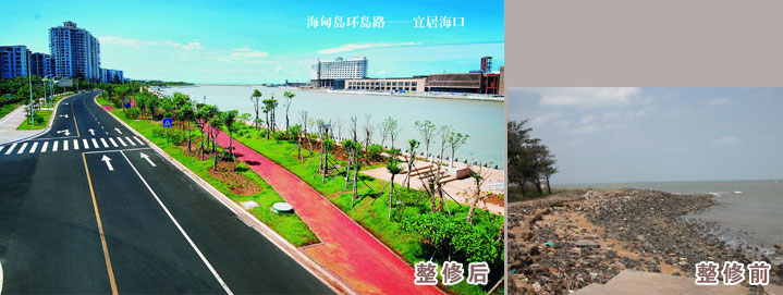 环岛路为生活性城市次要道路,绕海甸岛一周,全长约12.57公里;包括北部临海段,东部临江(横沟河)段和南部临海甸溪段(根据规划确定为海甸二路),西侧主要是沿美丽沙一带。项目于2007年2月开工,2011年6月完工。